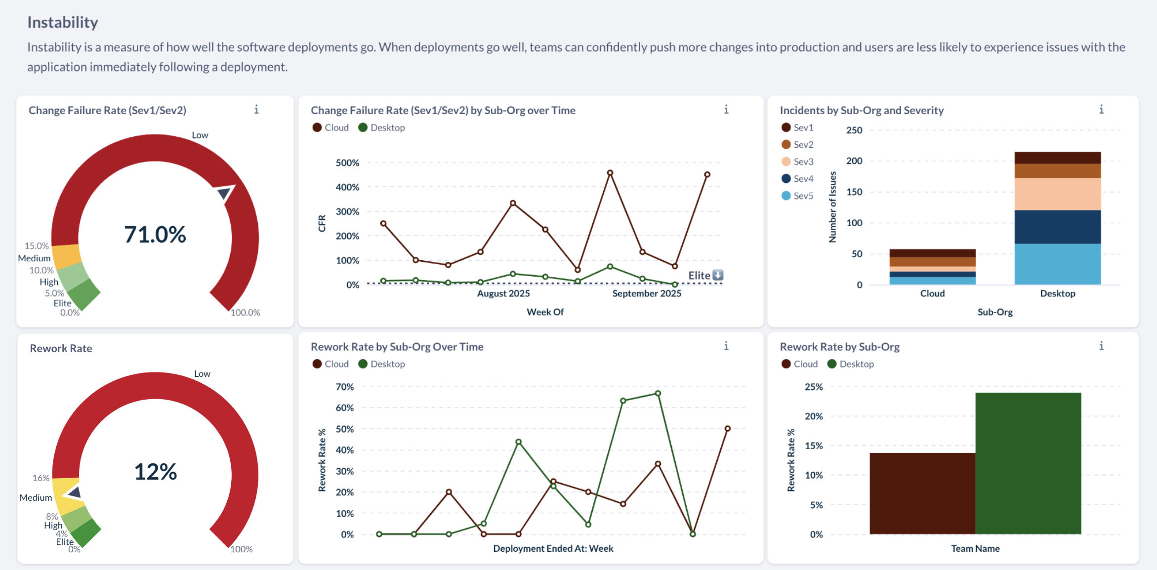 Together, these two instability metrics help you distinguish between "we ship fast and rarely break things catastrophically" versus "we ship fast with consistently high quality."