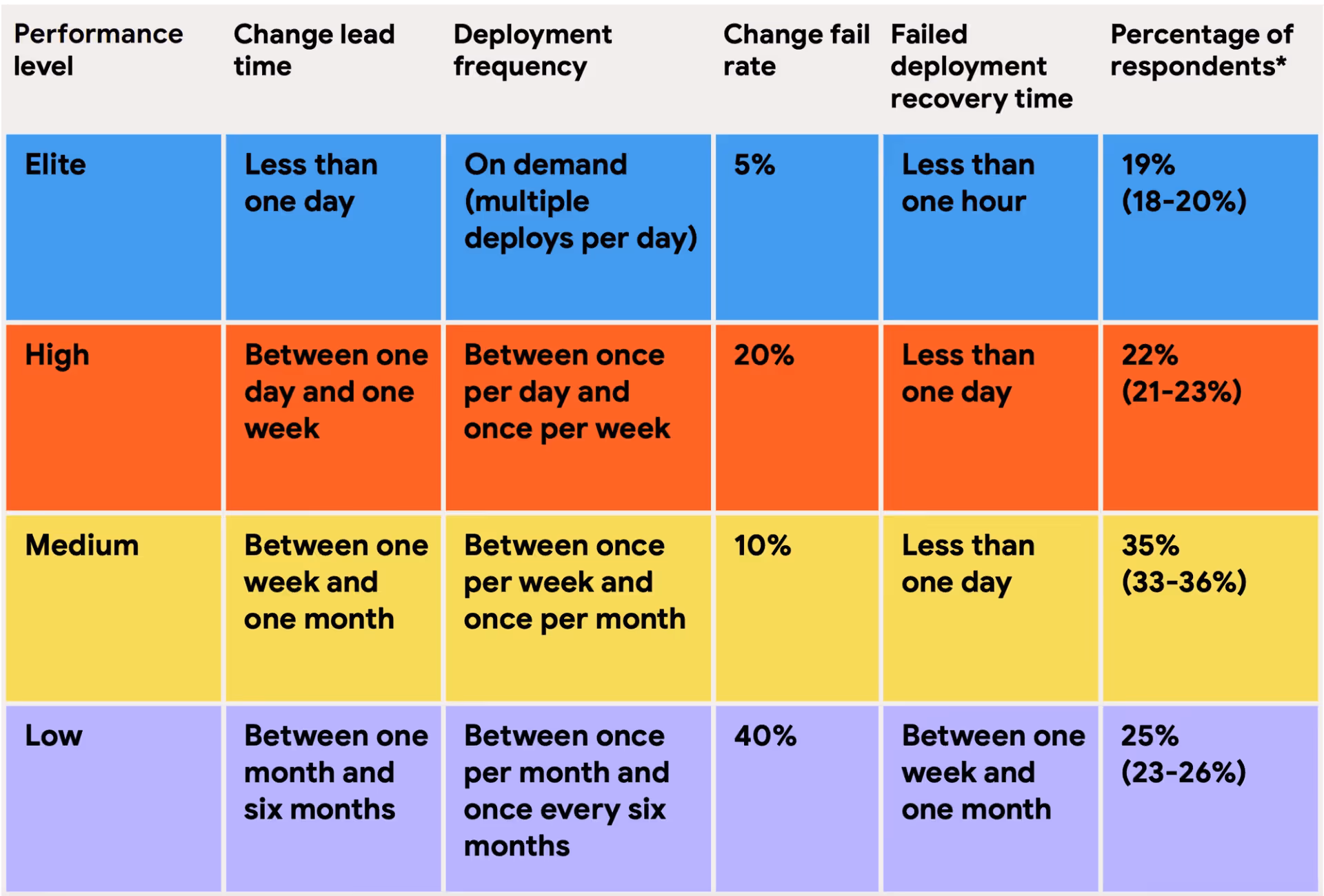 The table below taken from the State of DevOps Report 2024 summarizes four distinct performance profiles for engineering teams, with statistically significant differences in measures among them.