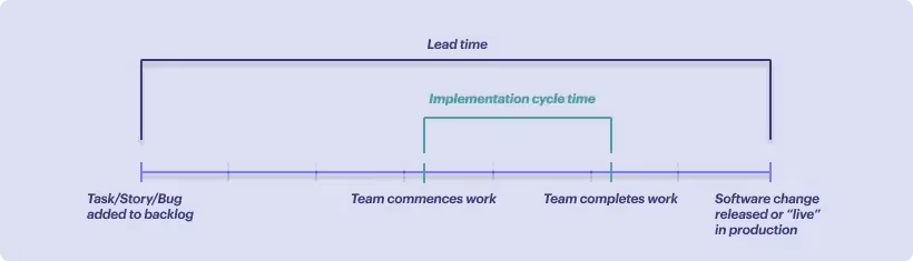 When it comes to software, there is some latitude in how lead time and cycle time are defined and measured. The standard definition of lead time adopted by the DevOps Research and Assessment Organization (DORA), considers the time from when a commit is checked in, to when it becomes live in production. Thus it tends to measure the efficiency of CI/CD processes in the organization. However one can take a broader view on this, measuring the end-to-end time for software delivery: