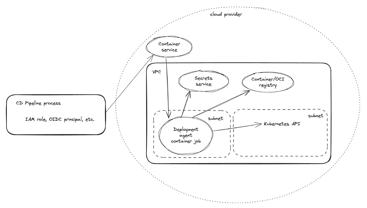 The deployment agent runs as a containerized job inside the same private network as the Kubernetes cluster. This ensures that access to the Kubernetes API server is secure and local—no need to expose it to the internet.