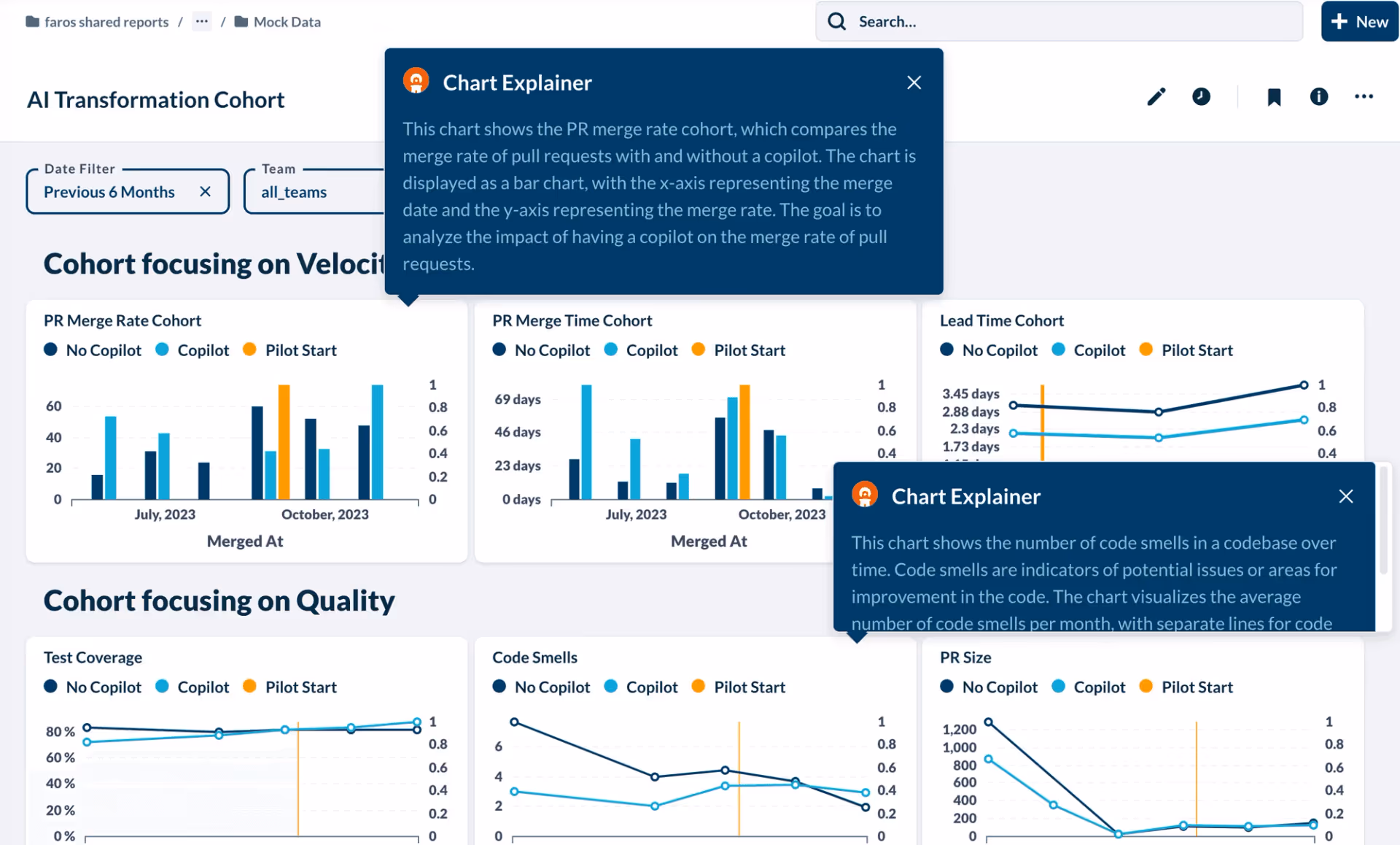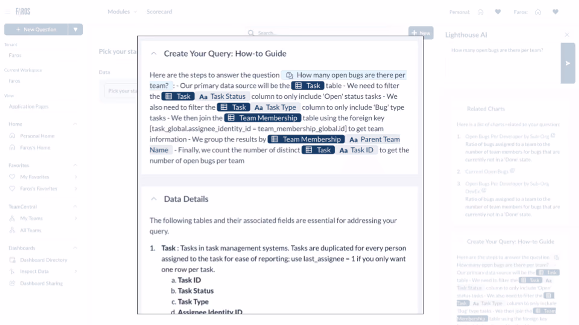 Lighthouse AI is a new Faros tool that leverages large language models to make all of your existing charts easier to use and also helps you create new ones.